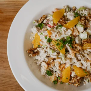 Gepocheerde peer met honing, walnoten en Gorgonzola (V)